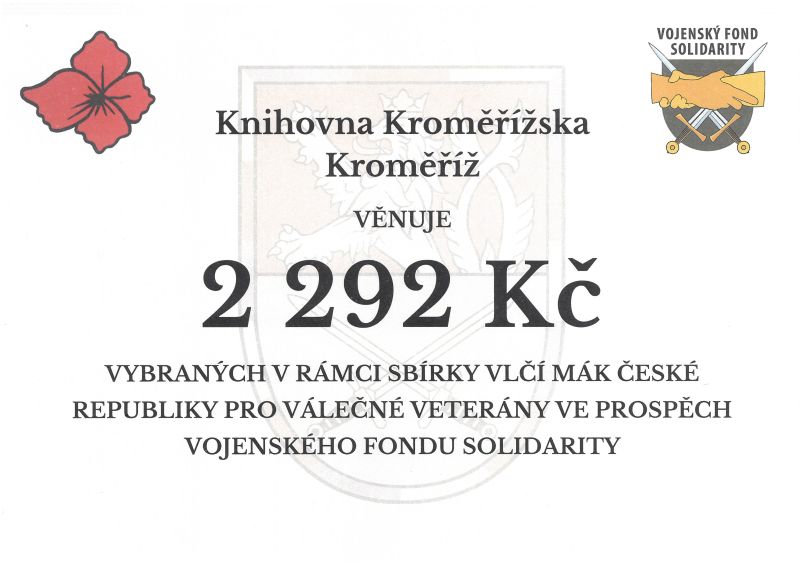 V naší knihovně byla v rámci sbírky Vlčí mák České republiky ve prospěch Vojenského fondu solidarity pro válečné veterány vybrána částka 2 292,- Kč.